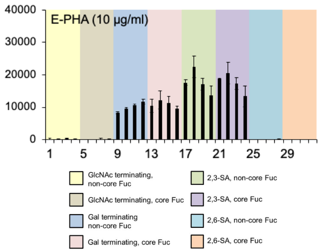 The E-PHA binding pattern included bi-, tri-, and tetraantennary N-glycans with or without α2,3-linked sialic acids, but no binding to GlcNAc-terminating or α2,6-sialylated N-glycans